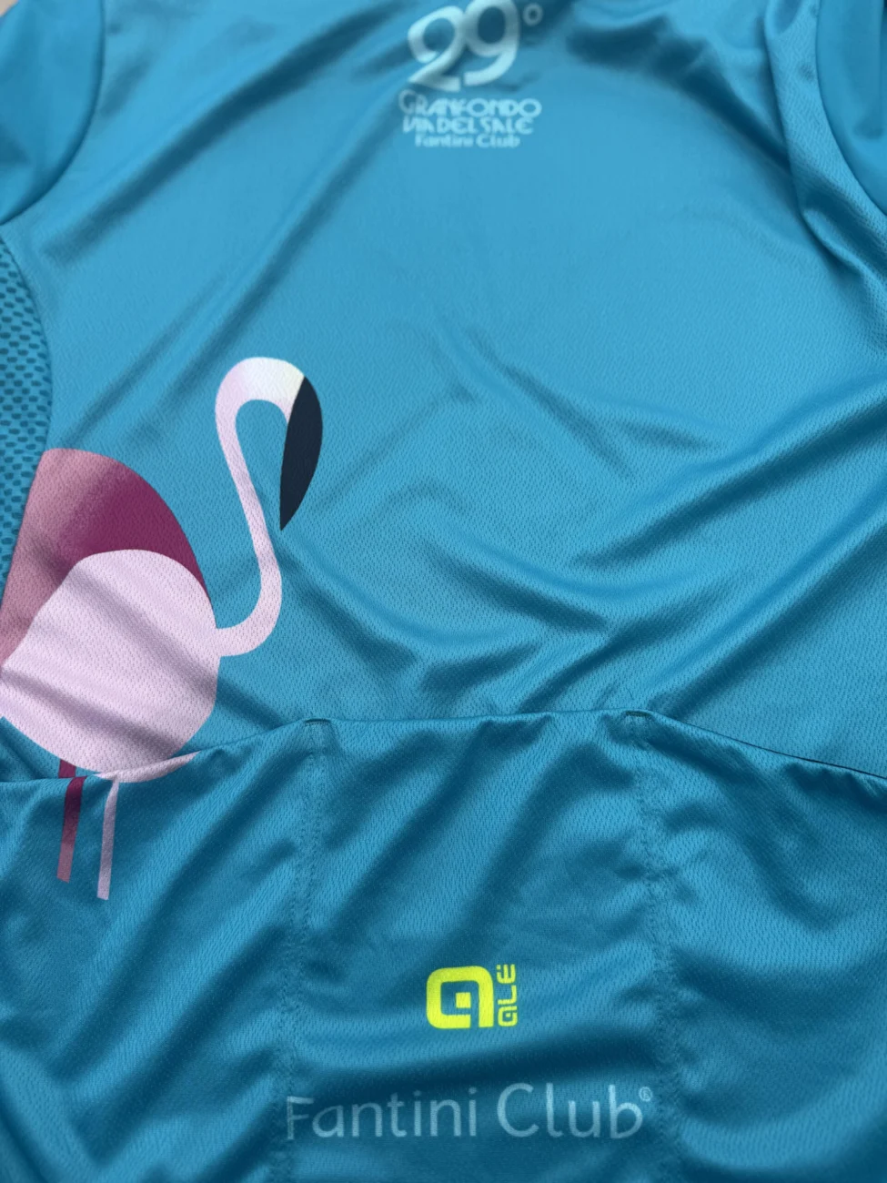 La maglia celebrativa Firmata Alé Cycling, la maglia ufficiale è stata realizzata da un tessuto ultraleggero con vestibilità skin fit, maniche a taglia laser che donano il massimo comfort all’atleta: una maglia pensata per far brillare ogni ciclista. A corredo la scelta del colore e della grafica: Il colore turchese dona una visibilità unica, il fenicottero simboleggia l’eleganza e l’equilibrio.